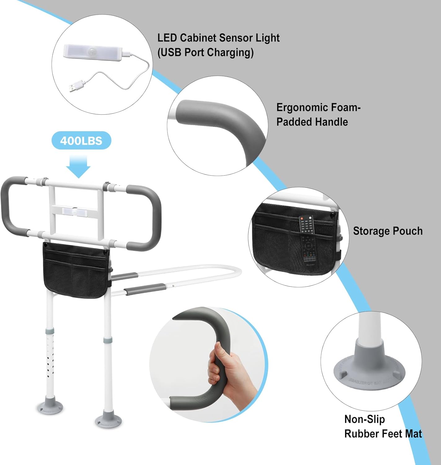 Night-Time Safety: To prevent dangerous falls, our bed rail includes a sturdy safety LED motion sensor light secured to it. The sensor light automatically activates when moved, increasing safety when using the toilet at night