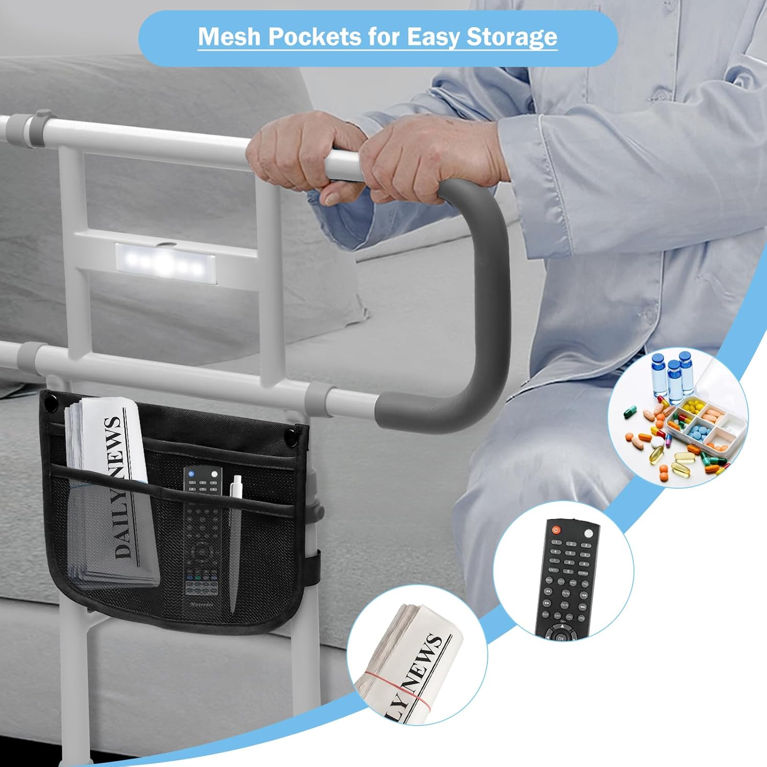 Portable Bed Rails: Our bed assist rails for seniors include a high-quality, lightweight, durable bag designed to perfectly store your glasses, TV remote, medications, or magazines. A portable bed rail can let you bring it to the places you want and support your daily use