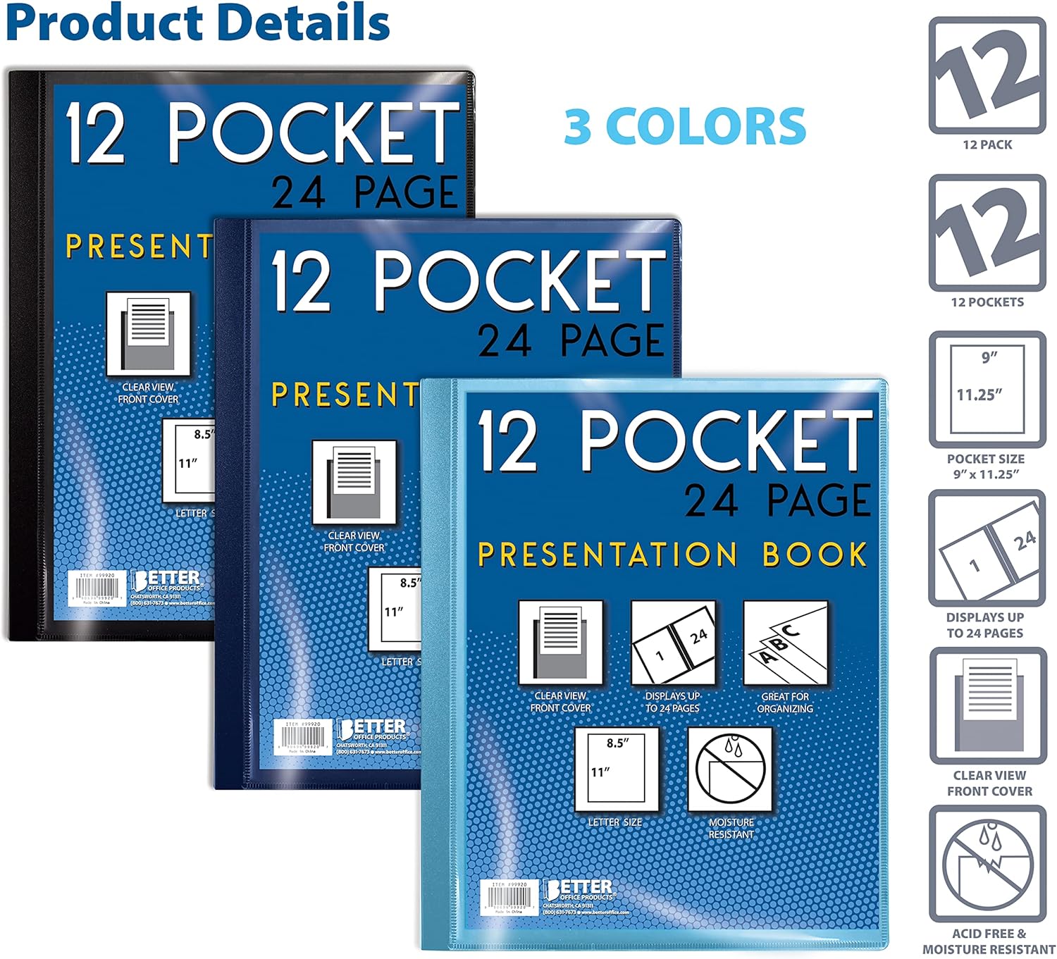 Better Office Products 12 Pocket Bound Presentation Book, Assorted Colors, Clear View Front Cover, 24 Sheet Protector Pages, 8.5″ x 11″ Sheets, Art Portfolio, Poly Covers, Letter Size (12 Pack)