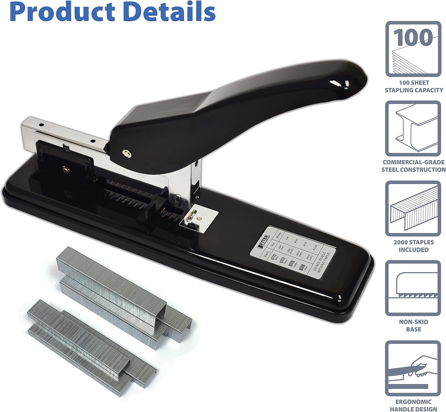 Better Office Products Heavy Duty Commercial Stapler with 2,000 Staples, Black Polished Steel, 100 Sheet High Capacity, Rounded Ergonomic Lever & Weighted Stability Base, Jam Free Large Stapler,