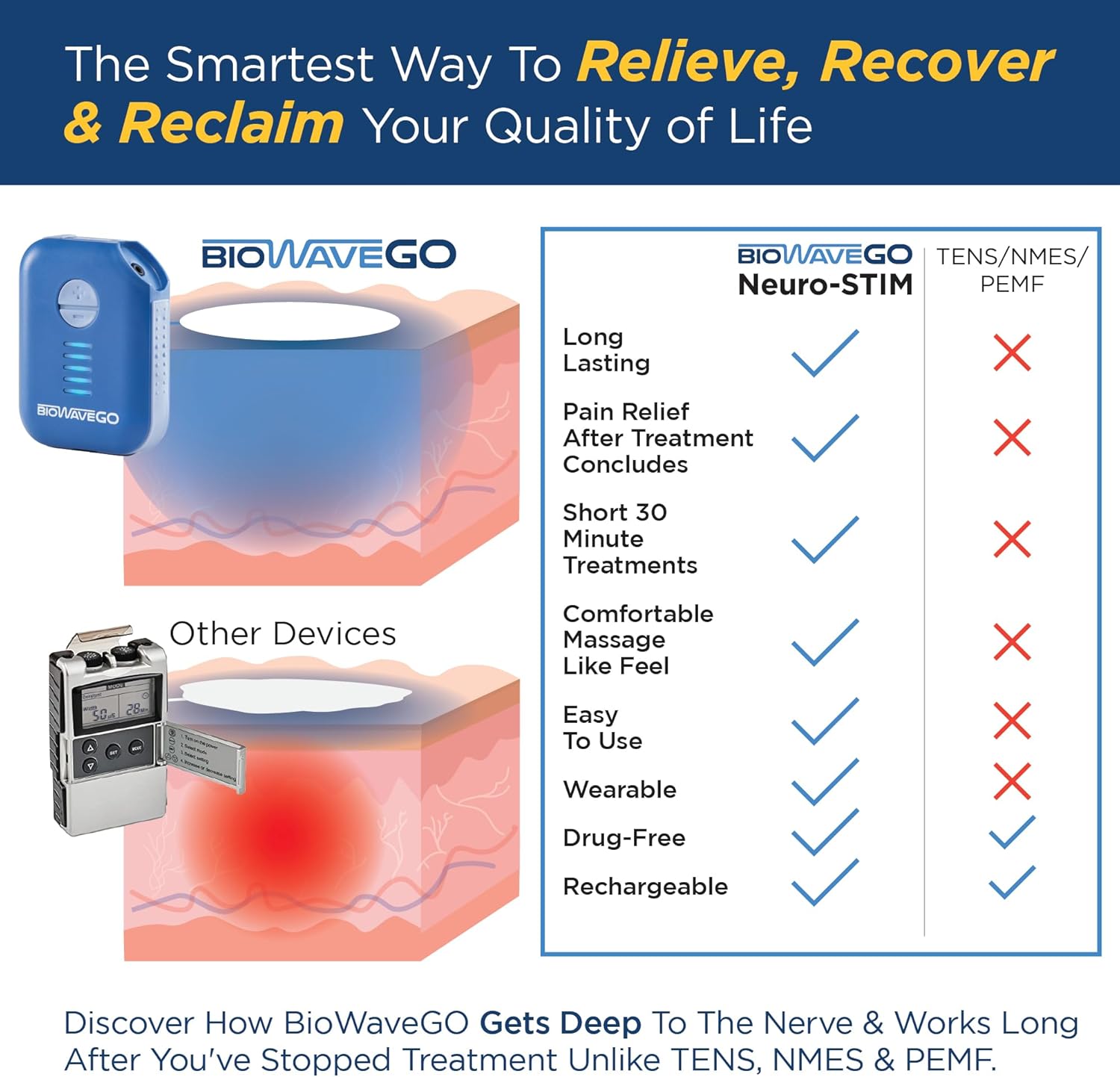 UNLIKE TENS NMES & PEMF BIOWAVEGO GETS DOWN TO THE NERVE & WORKS LONG AFTER YOU’VE STOPPED TREATMENT: Quickly relieve, recover & reclaim your life with the superior rechargeable tens unit alternative.
