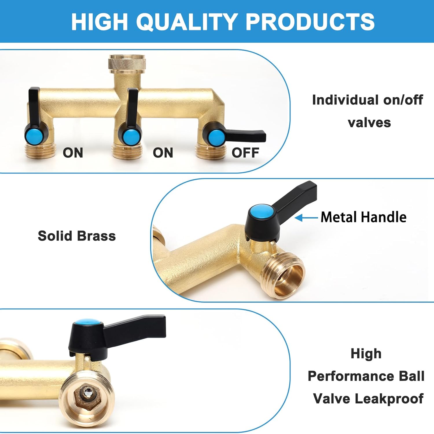 Brass Garden Hose Splitter, 3 Way Faucet Diverter with Extension Handles and Individual On/Off Valve, Outdoor Home Hose Pipe Tap Splitter, 3/4-Inch Female Inlet and 3/4-Inch