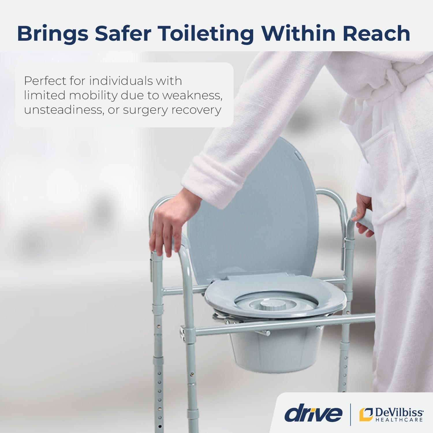 Increase bathroom safety and stability, regain your independence and dignity with the Drive Medical folding toilet chair for bariatric individuals and larger users weighing up to 350 pounds can be used as a bedside commode for elderly, individuals recovering from surgery or individuals which require additional assistance with toileting. A durable plastic snap-on seat and grey powder-coated lid, featuring steel welded construction, increase the strength and durability of this temporary toilet chair. For added comfort and safety, plastic arms, a 7.5 quart commode bucket with a carry handle, cover, and splash shield are also included. In addition to these safety features, this convenient tool-free commode folds for easy portability and can be moved throughout your home or taken on the go for activities like camping, tailgating, and other outdoor events. Backed by a limited lifetime warranty from Drive Medical, a leading brand of bath safety products, mobility aids, and other medical goods for more than 20 years, you can purchase with confidence.