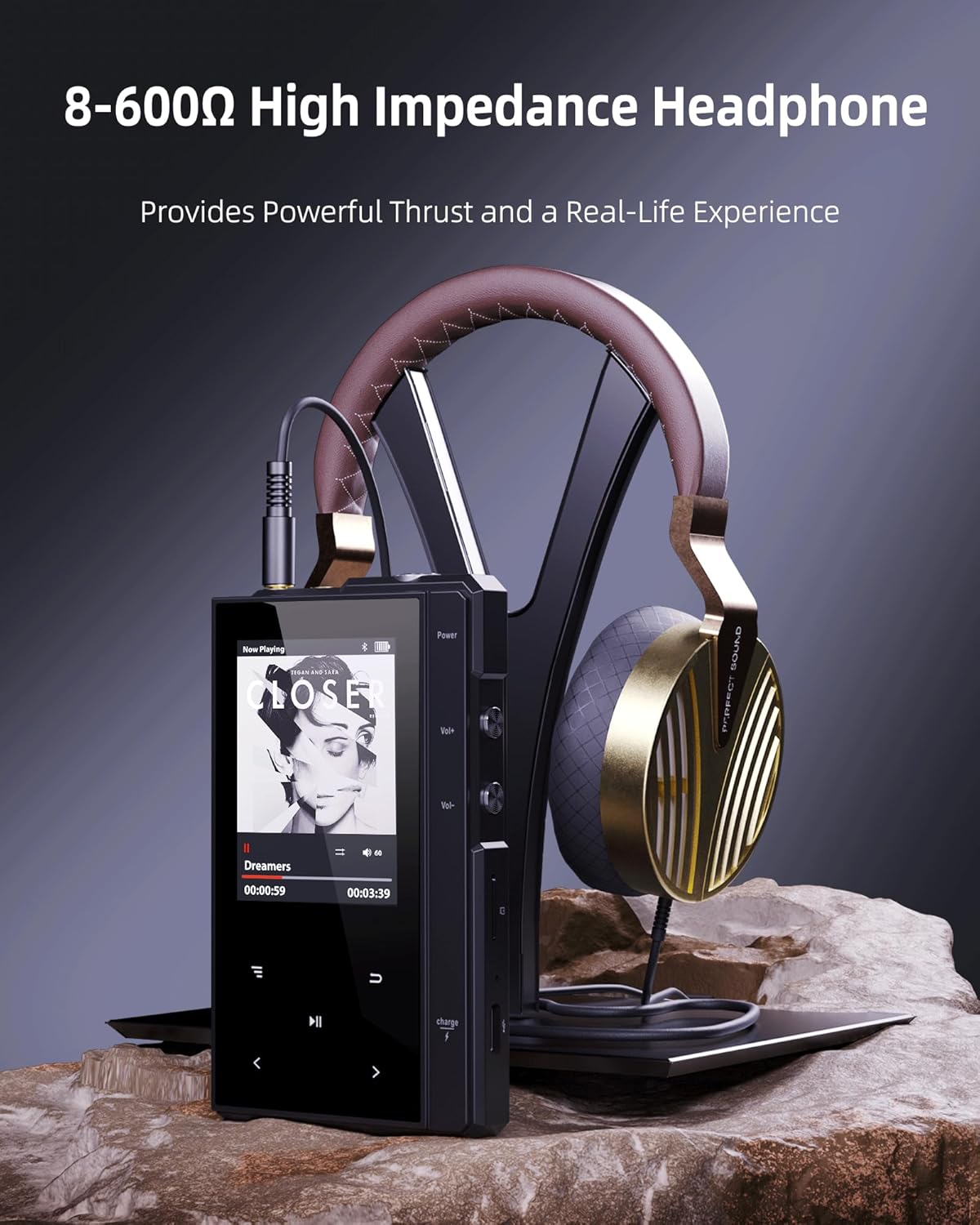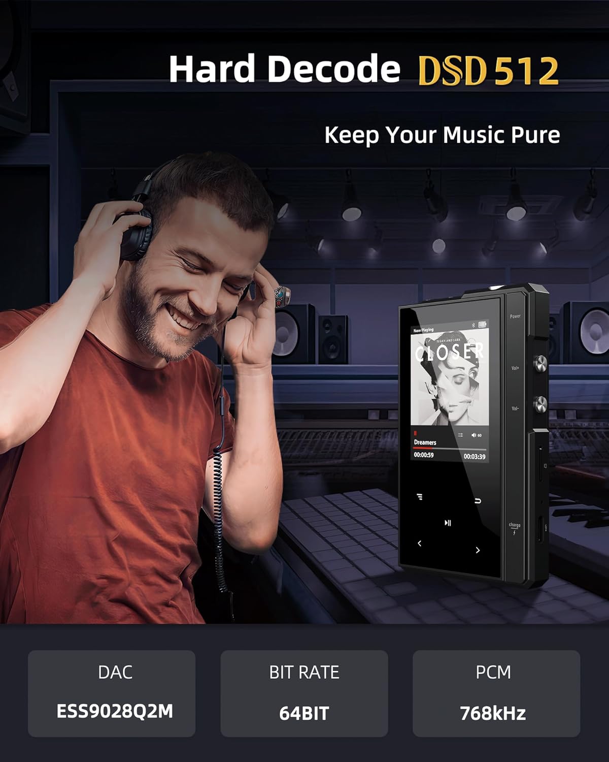 ♪-【High-Resolution Stereo Sound & DSD Codec】: The HiFi music player adopts high performance DSD decoder technology to retain native DSD512 audio source and restore live sound effect. With a maximum sampling rate of 64Bit/768KHz, more than 120 dB audio stereo DAC chip, supports most major lossless audio formats: MP3, DSF, WAV, FLAC, AAC, DTS, M4A etc