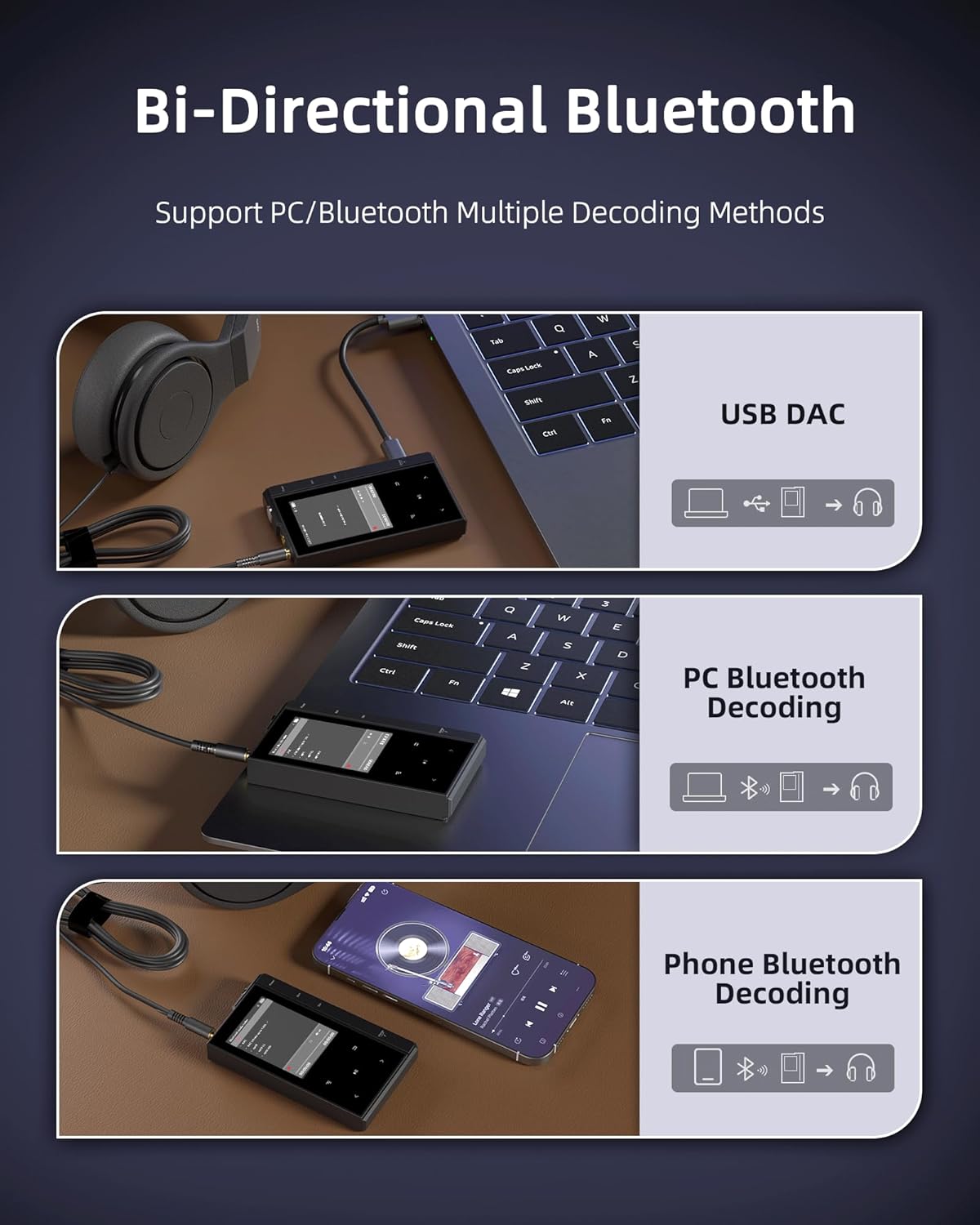 ♪-【Supports USB DAC】:This HiFi mp3 player can be connected to PC and mobile phone for external decoding amplifier; can also be used as a digital source by connecting it to a USB amp with DAC input