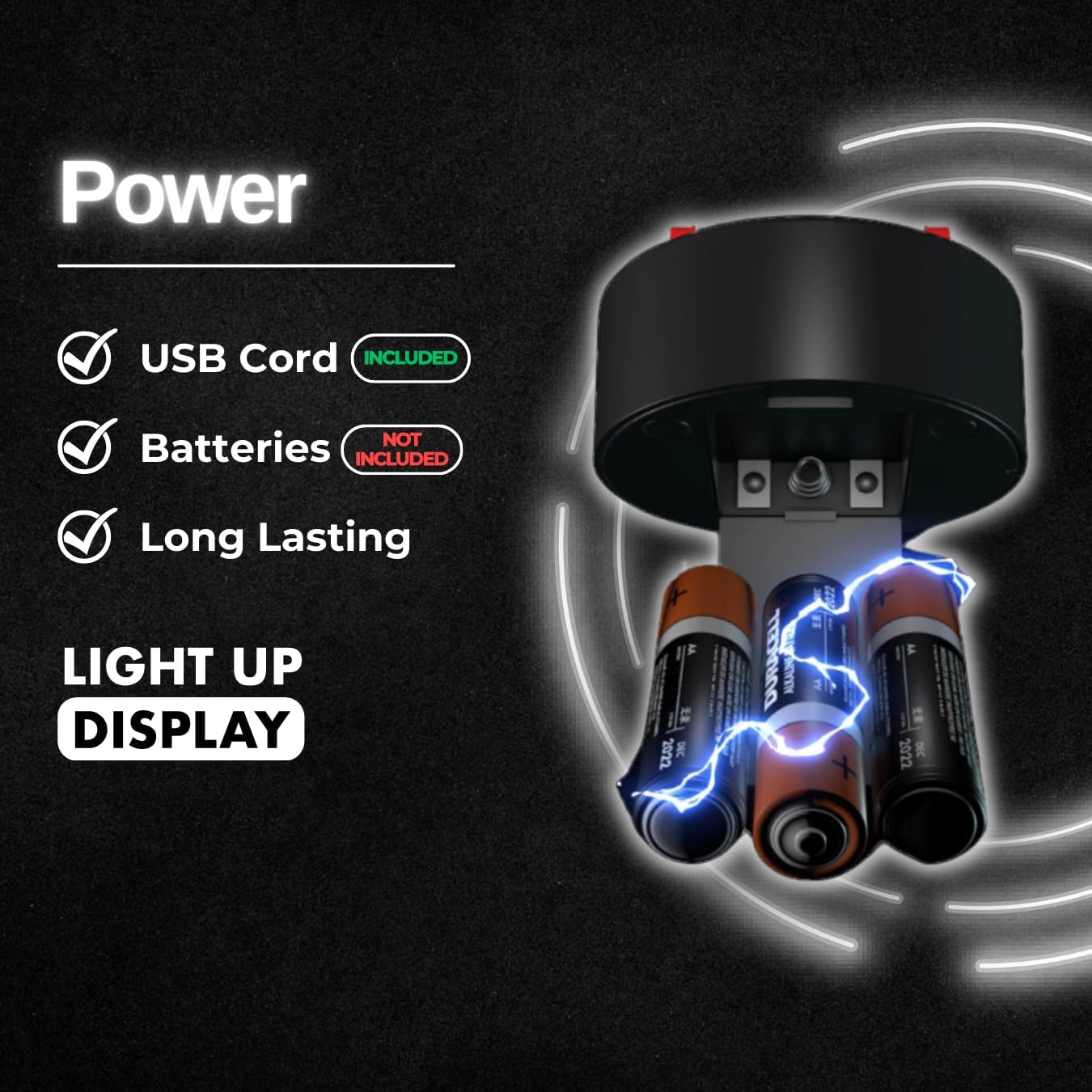 Powering it Up! – The Light Up Display uses 3AA Batteries (not included) to Power Up! If you prefer to use a wire, we make sure to include USB Cords with all stands!