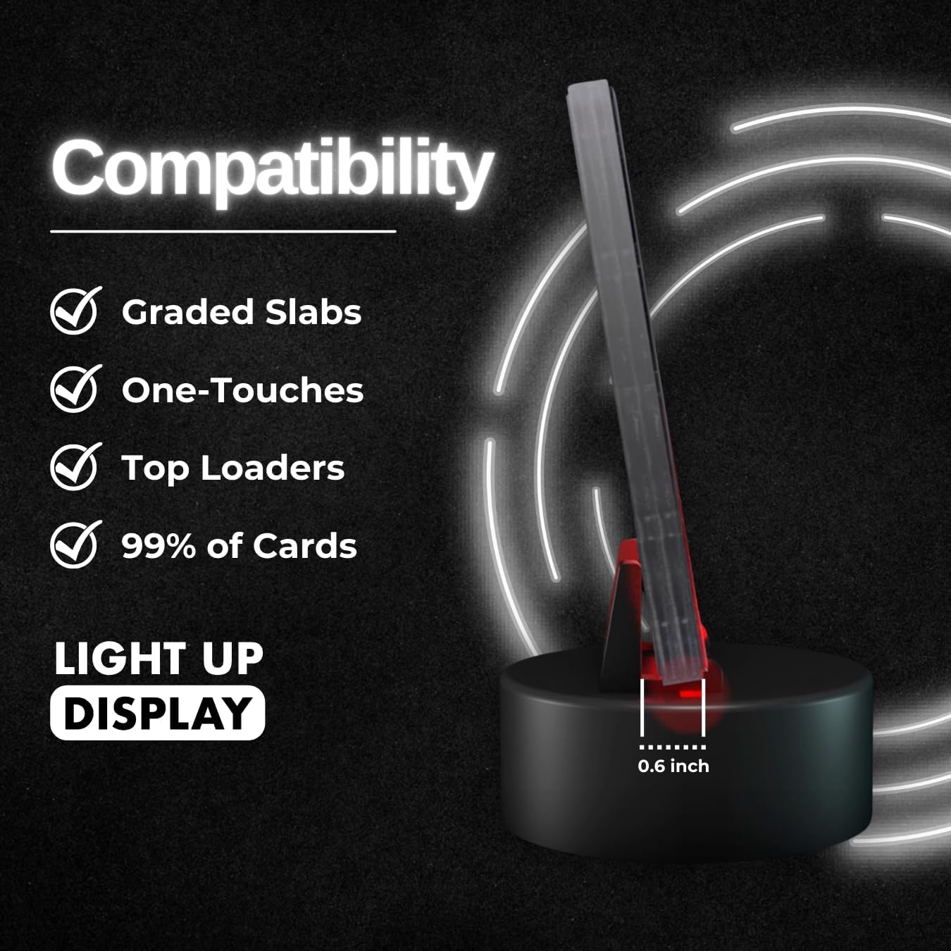 Compatibility – Our stand holds One-Touches, Graded Slabs, and Top Loaders up to 180pt. 99% of cards and cases fit in the Light Up Display.