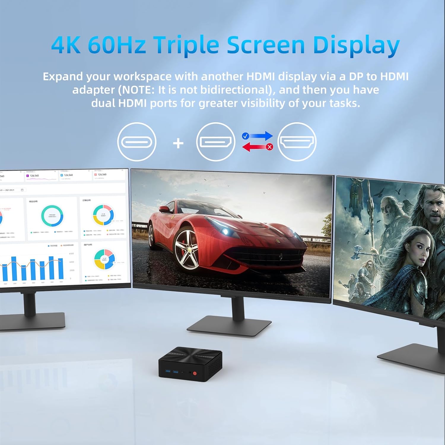 4K TRIPLE SCREEN DISPLAY: N100 mini pc is equipped with Intel UHD Graphics(max 750MHz), 1 x HMDI 2.0, 1 x DP V1.4(DP to HDMI adapter included) and 1x Type C(Full-function), it allows you to multi-task efficiently on three 4K 60Hz displays