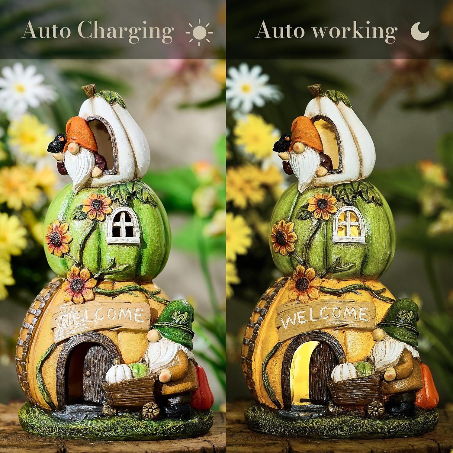 TERESA’S COLLECTIONS Outdoor Fall Decor with Solar Lights for Outside, Green Halloween Pumpkin Decor Garden Gnomes for Autumn, Fairy House Resin Fall Decorations for Home, Thanksgiving Gift,9.7″