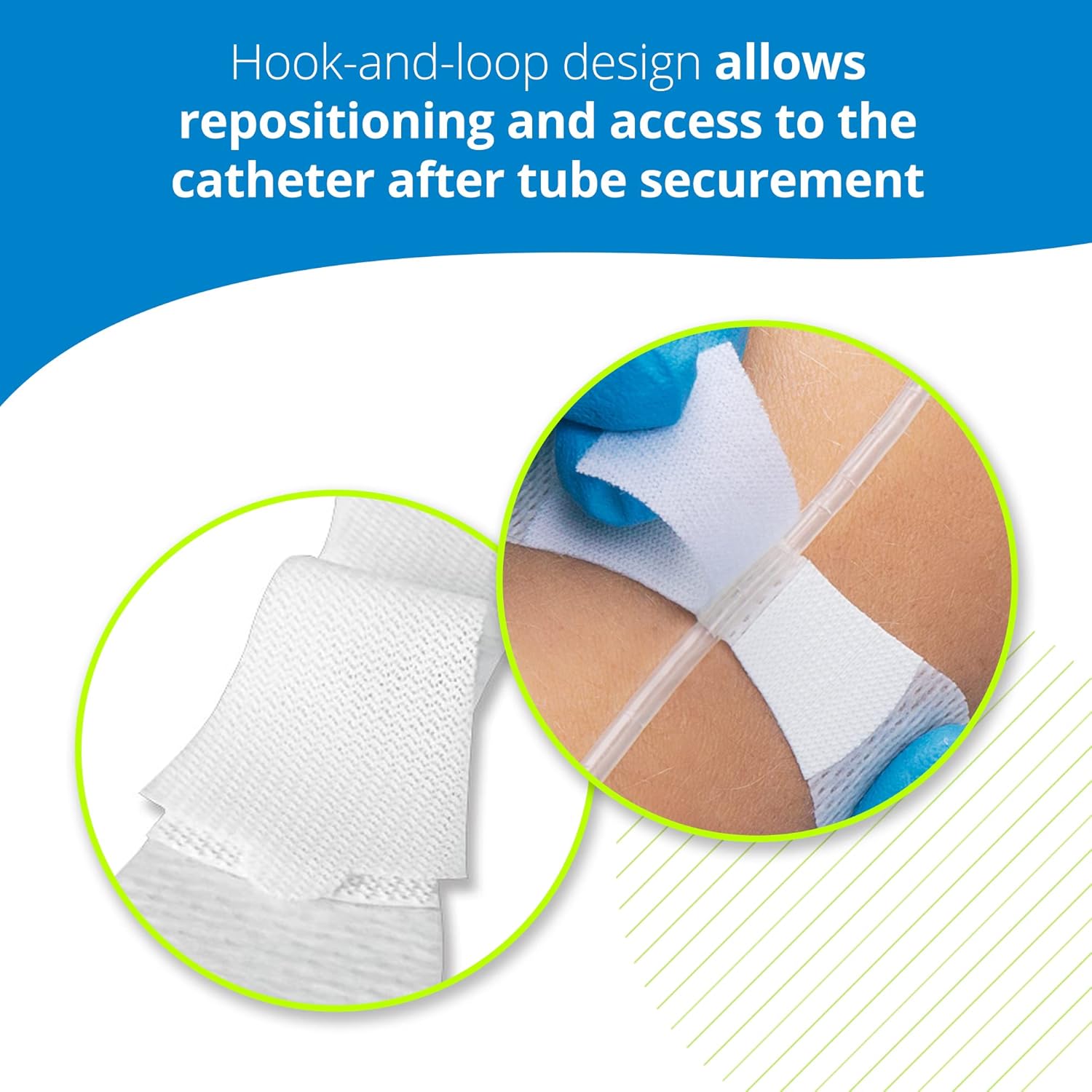 ADJUSTABLE AND ACCESSIBLE: Hook-and-loop design allows repositioning and access to the catheter after tube securement